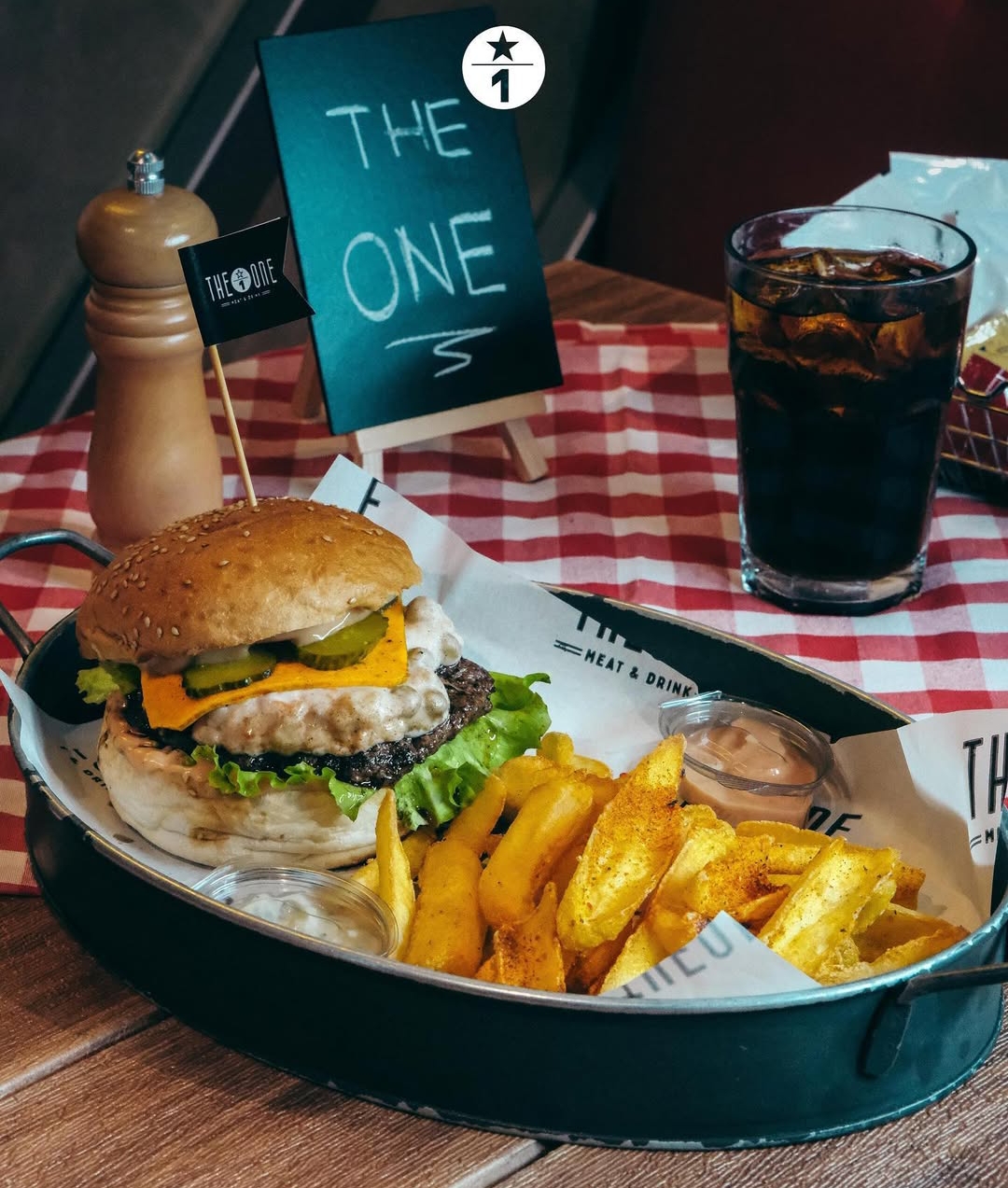 Dana burger köftesi, the one cheddar sos, dilim kaşar peyniri, ızgara hellim peyniri, kornişon turşu ve patate...