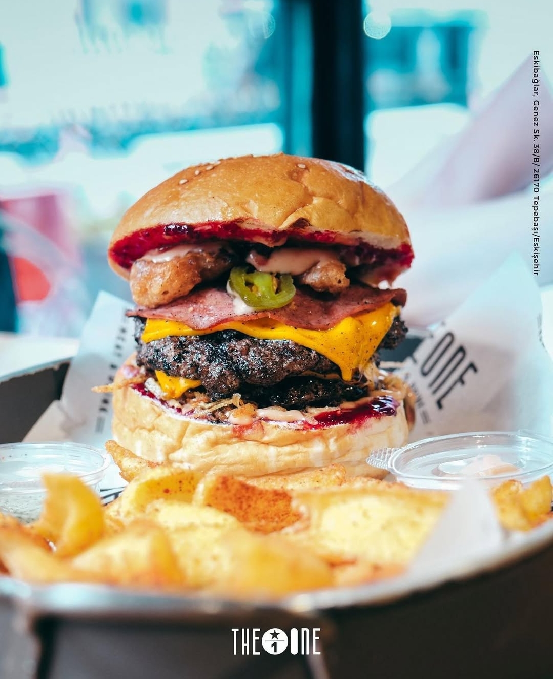 Dana burger köftesi, jalapeno biber, közlenmiş biber, acı sos, karamelize soğan, cheddar peyniri ve patates kı...
